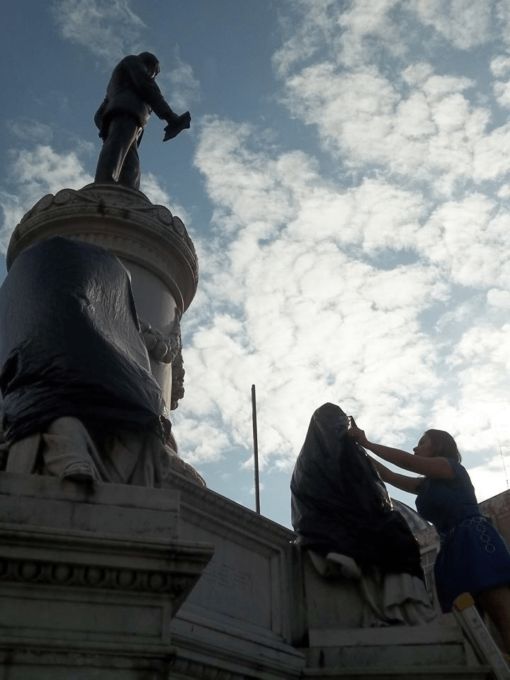 Translator’s Note: These poetic excerpts come from Elena Salamanca’s book Landsmoder, which was written for a performance she staged in 2011 where, dressed like a “president’s wife,” she mounted a national monument in San Salvador (see cover image), cloaked the carvings of the 5 women at the bottom of the monument in what looked like body bags, placed funeral wreaths of cypress at the base, and read the entire book of poems “en voz alta” with a “military band” in attendance.