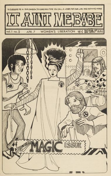 In the late 60s, Trina moved from NYC to San Francisco to be at the epicenter of the underground comix scene. In 1970, she founded the underground feminist newspaper It Ain’t Me Babe, whose first cover featured “hippie scientists in a lab having just brought to life the bride of Frankenstein,” and whose tagline read “To subsume me in your shadow, to come each time you call, a lover for your life and nothing more” (an overt and pithy homage to the Bob Dylan classic, It Ain’t Me Babe).