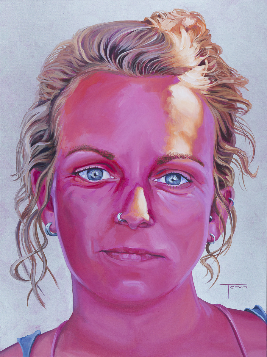 The portraits are purposely large and looking directly at the viewer so that we cannot avoid their presence. We are forced to engage with them. They are painted in a realistic manner so as to accurately represent the subjects, yet I heightened the color to add an expressionistic level of emotion. I kept the backgrounds simple, and I feel the metallic adds an element of elegance or a feeling of elevated status as with a religious icon. The other quality of metallics is the shine, which changes quickly as we move. This gives the paintings a dynamic feeling. I painted these portraits to be attractive and compelling, hoping that viewers would be interested in finding out more about the individual subjects, even prompting and inspiring action. We all have better versions of ourselves available to us.